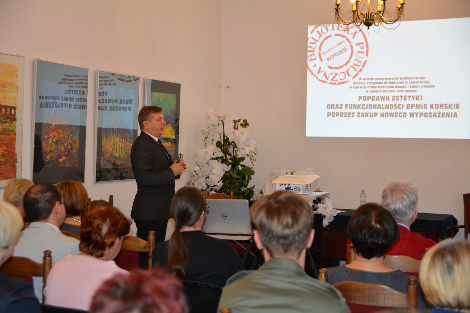 Korzystając z okazji spotkania z szerokim gronem bibliotekarzy powiatowych oraz władzami, dyrektor BPMiG Końskie Dariusz Kowalczyk dokonał podsumowania realizacji zadania pn. „Poprawa estetyki oraz funkcjonalności BPMiG Końskie poprzez zakup nowego wyposażenia”, dofinansowanego ze środków MKiDN w ramach „Narodowego Programu Rozwoju Czytelnictwa” Priorytet 2 „Infrastruktura Bibliotek 2016-2020”. W wyniku realizacji tego zadania Biblioteka wzbogaciła się o nowe meble, urządzenia elektryczne i sprzęt elektroniczny o łącznej wartości 320 000 zł.