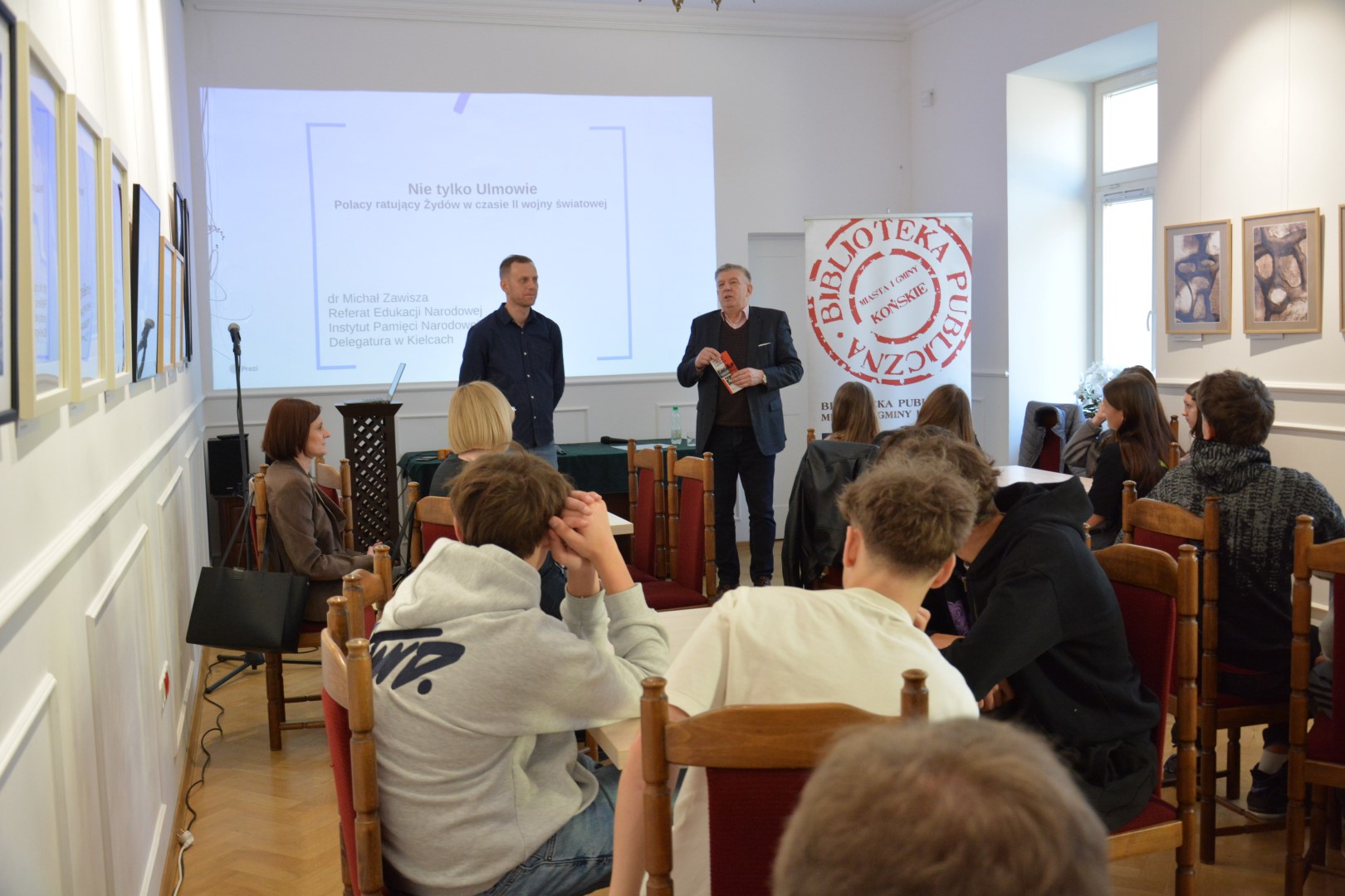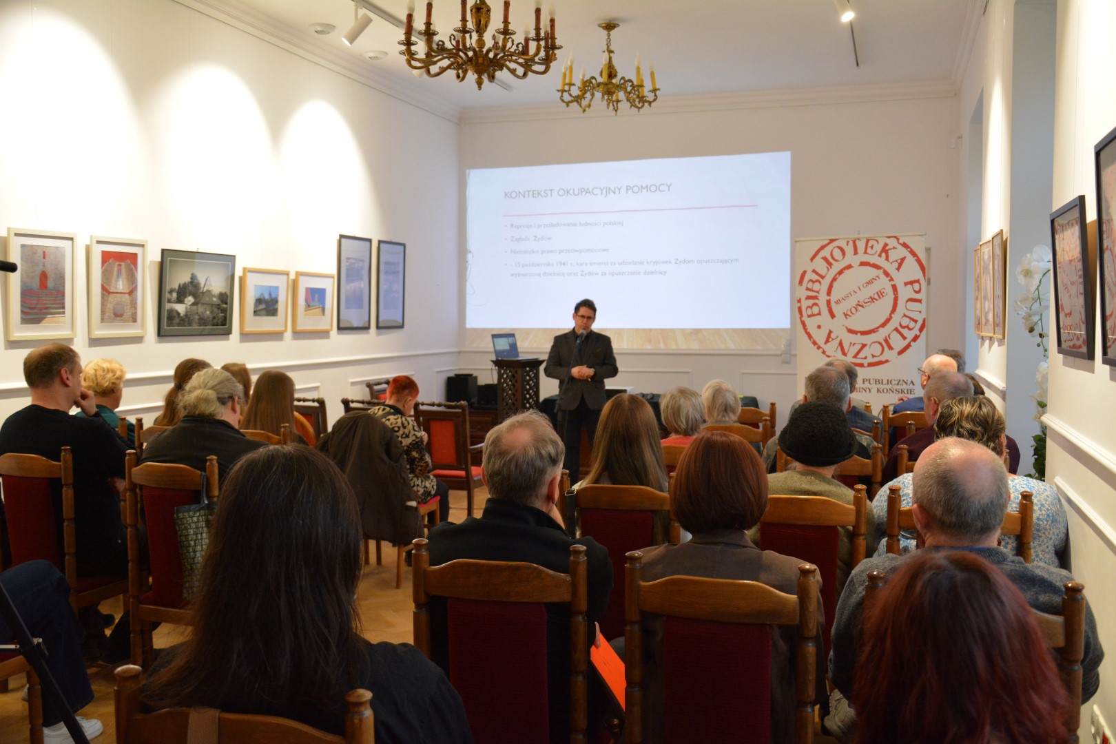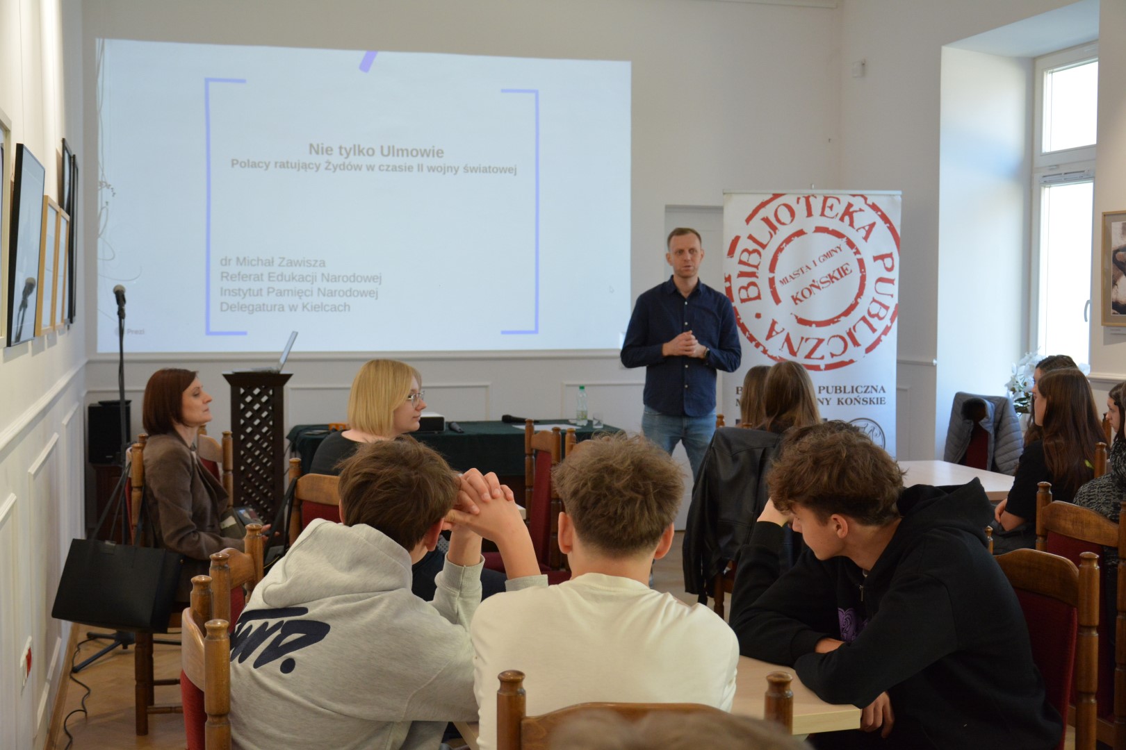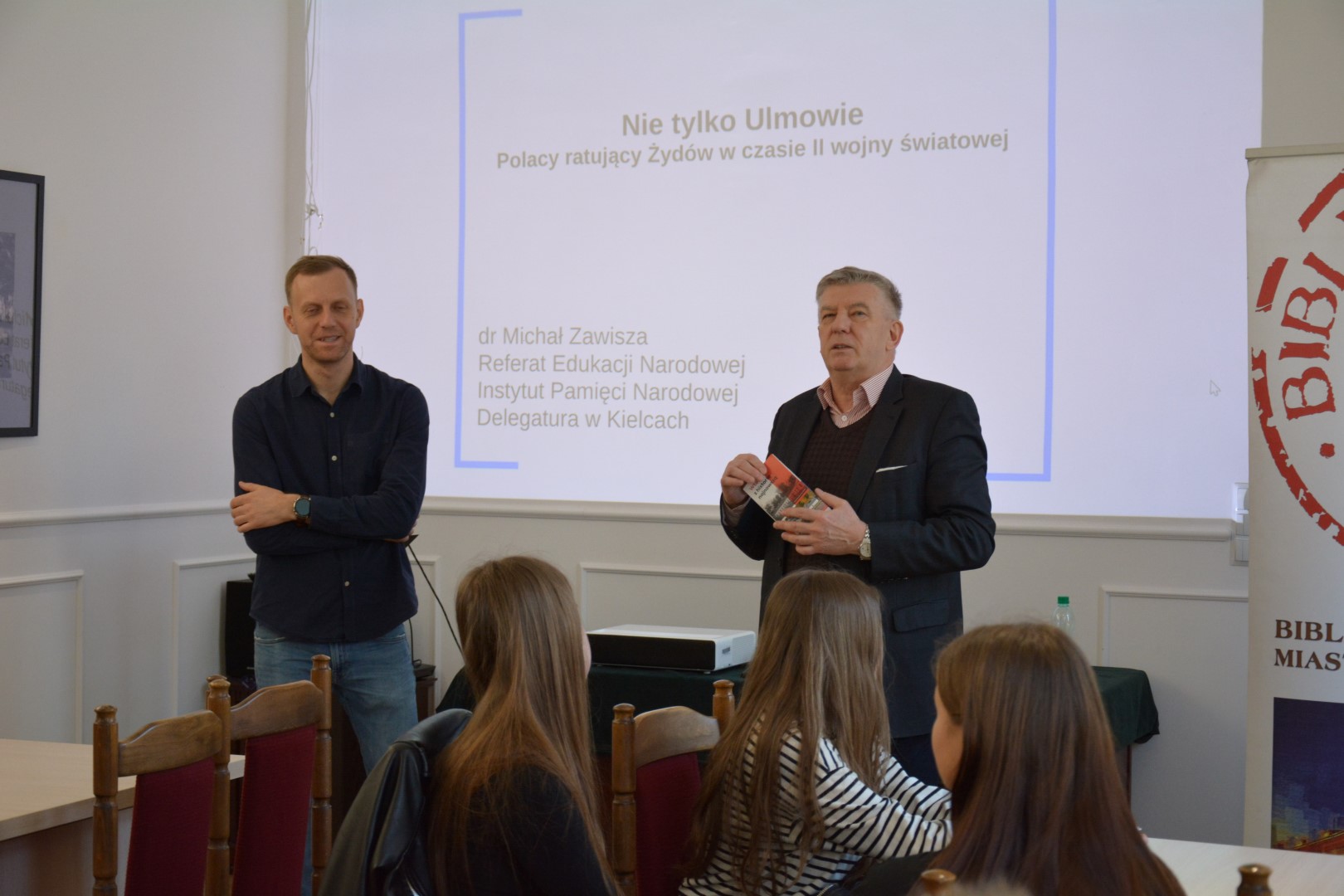 Popołudniowy wykład pt. „Polacy ratujący Żydów w czasie II wojny światowej w regionie kieleckim” poprowadził dr Tomasz Domański, specjalizujący się w historii II wojny światowej i relacjach polsko-żydowskich, kierownik centralnego projektu badawczego IPN „Dzieje Żydów w Polsce i stosunki polsko-żydowskie w latach 1917–1990”. Spotkaniom towarzyszyła wystawa planszowa w holu Biblioteki, która będzie udostępniona zwiedzającym do 14 kwietnia br.